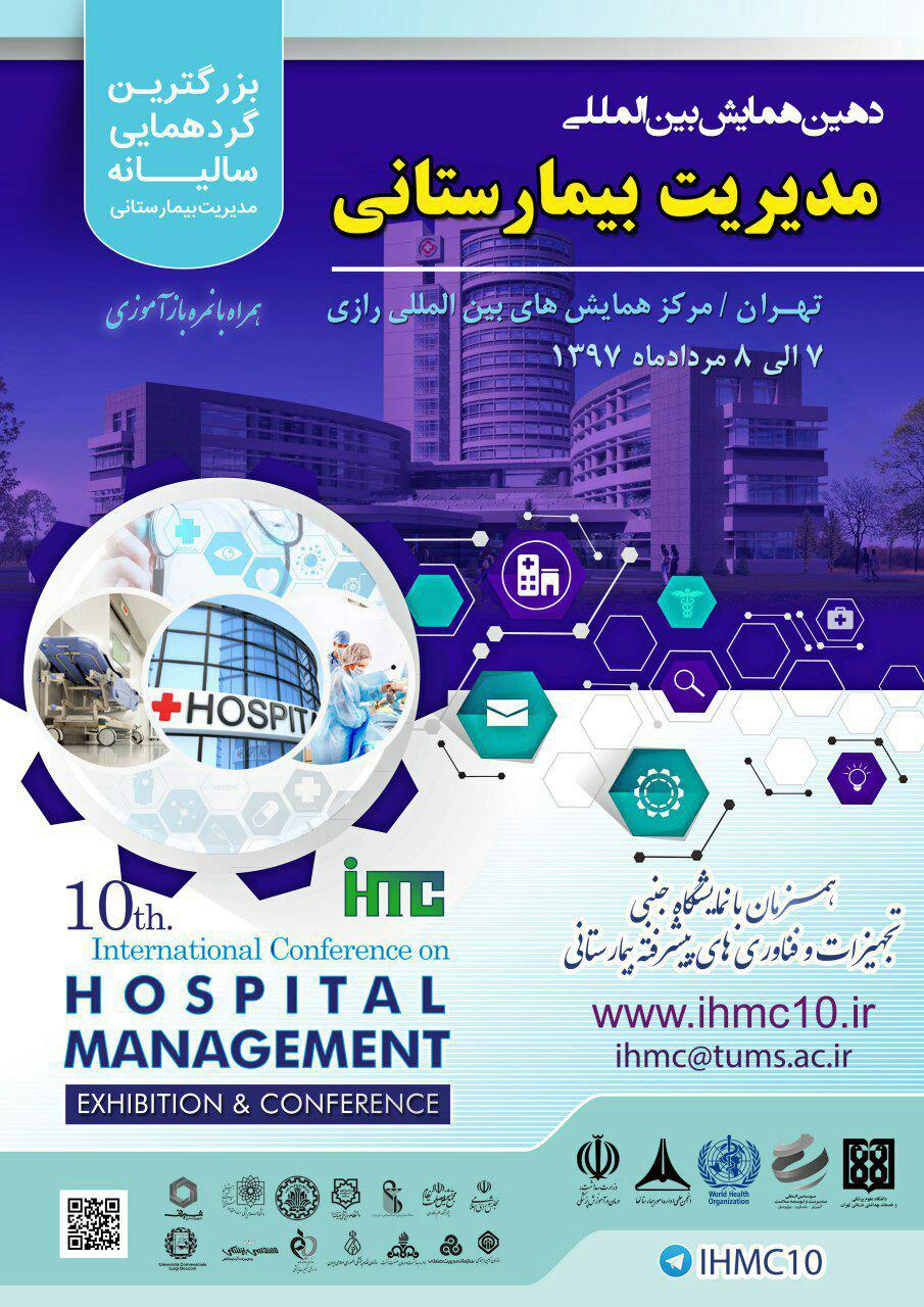 دانشگاه علوم پزشکی تهران و انجمن علمی اداره بیمارستانها با همکاری وزارت بهداشت، درمان و آموزش پزشکی و دیگر نهادهای مرتبط در نظر دارد تا دهمین همایش بینالمللی مدیریت بیمارستانی را هفتم تا هشتم مردادماه ۱۳۹۷ با رویکرد بهرهوری در بیمارستان در محل مرکز همایشهای بینالمللی رازی برگزار کند.