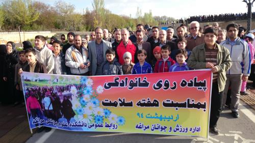 مراسم بزرگ پیاده روی خانوادگی به مناسبت هفته سلامت با حضور گسترده مردم علاقه مند ، رییس دانشکده علوم پزشکی و اعضای هیات رییسه و جمعی از کارکنان دانشکده علوم پزشکی مراغه در صبح روز جمعه برگزار گردید. در این مراسم که با استقبال چشمگیر مردم و علاقه مندان مواجه بود، شرکت کنندگان با تجمع در میدان عبدالقادر مراغه ای مسیر پیاده روری را با شور و نشاط کم نظیر آغاز و با طی مسافتی در پارک معلم به پیاده روی خود پایان دادند. دراین مراسم آقای دکتر علی جنتی با اشاره به اهمیت ورزش و تحرک جسمانی در زندگی روزمره ، تاکید کردند که با توجه به تغییرات گسترده در سبک زندگی و ضرورت حفظ سلامتی و پویایی مردم ، همه باید در طول هفته بصورت منظم و مستمر ورزش و تحرک بدنی را در برنامه های خود داشته باشند. ایشان همچنین با تبریک هفته سلامت و یادآوری شعار هفته سلامت با عنوان " ایمنی غذا از مزرعه تا سفره " ، توجه اساسی به امنیت غذایی و تغذیه سالم را مهم و حیاتی دانسته و از عموم مردم خواستند تا با تغییر و بهبود سبک زندگی و رعایت اصول تغذیه سالم ؛ از بروز بیماریها و مشکلات بهداشتی شایع امروزی پیشگیری نمایند. در پایان مراسم پیاده روی، از طرف دانشکده علوم پزشکی مراغه دو عدد دوچرخه و 15 دستگاه اندازه گیری فشار خون و قند خون به قید قرعه به حاضرین اهدا گردید. این مراسم با مشارکت اداره ورزش و جوانان و شهرداری و نیروی انتظامی شهرستان برگزار گردید.