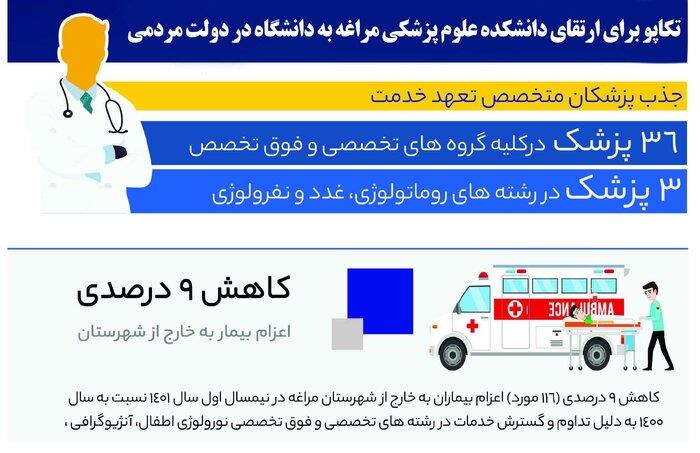 گسترش خدمات درمانی مراغه در رشتههای تخصصی و فوقتخصصی از جمله در نورولوژی اطفال و آنژیوگرافی موجب شده است تا اعزام بیمار به خارج از شهرستان به میزان ۹ درصد در سال جاری کاهش یابد و یکی دیگر از دستاوردهای دولت مردمی در این منطقه به بار نشیند.